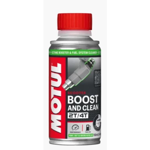 BOOST AND CLEAN SCOOTER 100ML Et drivstoffadditiv som skal tilsettes bensin, som kan brukes i alle typer 2-takts og 4-takts motorsykkelmotorer. Den kraftige og dedikerte formelen tillater både å øke oktantallet og å rengjøre forgassere, injektorer, ventiler, overføringsporter og forbrenningskamre. Renser og smører også hele drivstoffkretsen. MOTUL BOOST AND CLEAN MOTO er et bensintilsetningsstoff som er kompatibelt med E10-drivstoff (etanol 10 %).