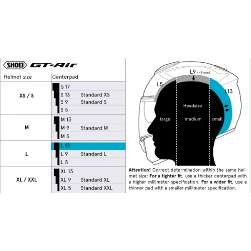 En rekke hodeputer i forskjellige størrelser kan brukes til å erstatte den originale polstringen eller for å tilpasse hjelmen i det øvre hodeområdet. Polstringen til en hjelmmodell er utskiftbar innenfor rammen av størrelsesfordelingen, f.eks. "L5" - "L9" - "L13". "L5" står for en tynnere, "L13" for en tykkere polstring, som vist i følgende diagram.